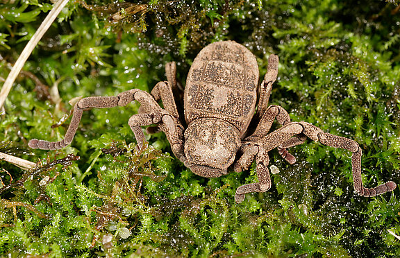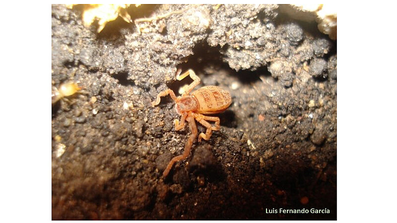 Ricinuleids have a locking mechanism between the prosoma (head region) and opisthosoma (2nd body part) that can be unhooked curing mating and egg laying. The 3rd leg of the male is specialized for sperm transfer. Ricinuleids have six-legged nymphs (1st post-egg larval stage), similar to Acarina. They can live 5 – 10 years.