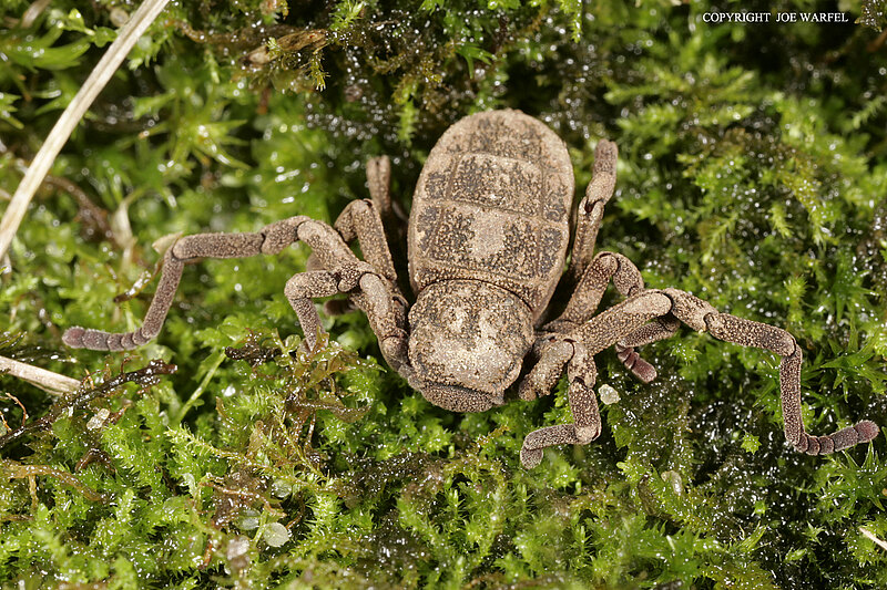 These small arachnids (5 – 10 mm in length) have very thick, sculptured cuticle. The pdeipalps are short and end in pincers. They are active at night and all species are thought to be either completely lacking eyes or with just a pair of pale, light-sensitive organs. They are called hooded tick-spiders because their chelicerae (jaws) are covered with a hinged hood-like plate called the cucullus.
